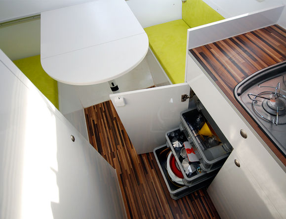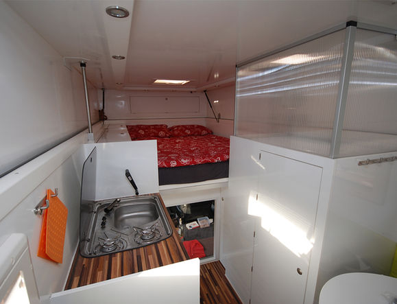 Die Aufgabenstellung war, auf kleinster Fläche einen voll funktionsfähigen Reisemobil-Grundriss zu entwerfen, der Platz für 2-4 Personen bietet. Eine weitere Herausforderung war, dass eine vorgegebene maximale Fahrzeughöhe nicht überschritten werden durfte, und somit eine Hubdachkonstruktion entwickelt werden musste. Das Ergebnis war eine von außen klein anmutende Kabine mit einem von innen betrachtet großzügigen Platzgefühl.